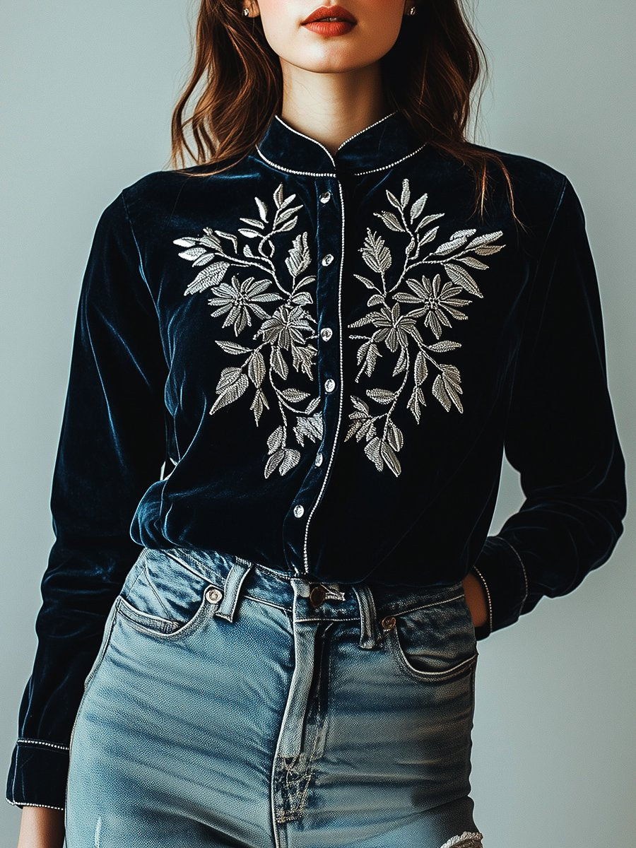 Stylish Silver leaves Embroidery Single-breasted Velvet Shirt